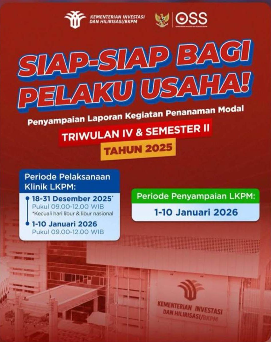 Sesuai ketentuan Kementerian Investasi, periode resmi penyampaian LKPM akan berlangsung 1–10 Januari 2026. Pelaporan ini wajib bagi seluruh perusahaan yang memiliki izin usaha berbasis risiko melalui OSS.