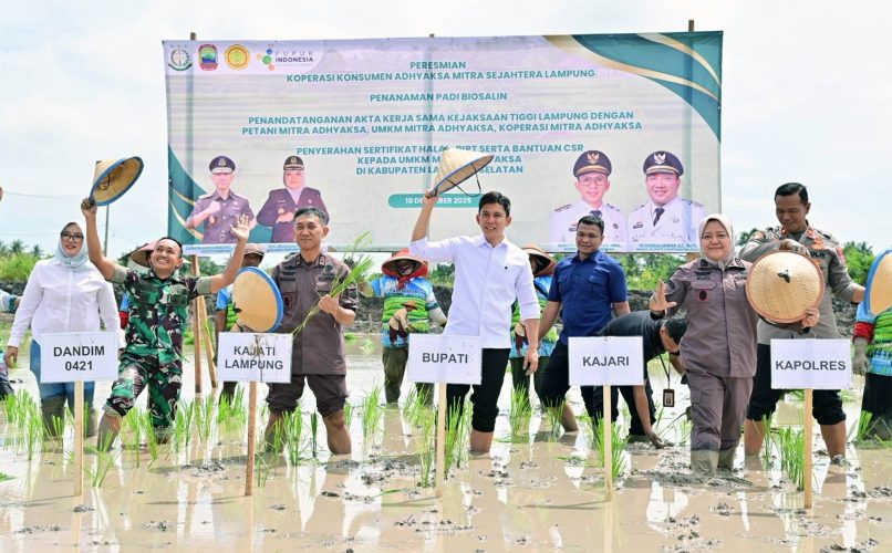 Sinergi tersebut diwujudkan melalui penanaman padi biosalin di Desa Bandar Agung, Kecamatan Sragi, yang dibarengi dengan peresmian Koperasi Konsumen Adhyaksa Mandiri Sejahtera Lampung, penyerahan sertifikat halal dan PIRT, bantuan CSR untuk UMKM, serta penandatanganan sejumlah akta kerja sama kelembagaan.