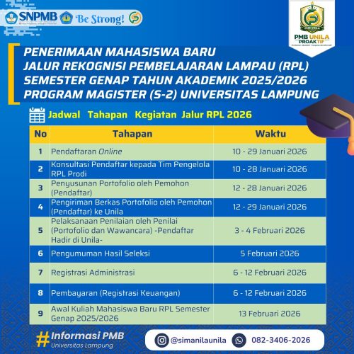 Bandarlampung, MERATA.ID – Universitas Lampung (Unila) kembali membuka Penerimaan Mahasiswa Baru (PMB) Program Magister (S-2) melalui Jalur Rekognisi Pembelajaran Lampau (RPL) untuk Semester Genap Tahun Akademik 2025/2026.