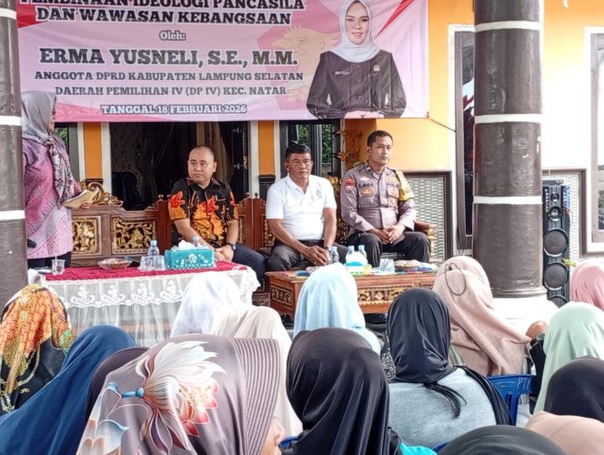 Lamsel, MERATA.ID – Kegiatan reses sekaligus kunjungan kerja Ketua DPRD Kabupaten Lampung Selatan Daerah Pemilihan (Dapil) IV, Erma Yusneli, berlangsung di Dusun III Sumbersari, Desa Mandah, Kecamatan Natar, Senin (16/2/2026). Momentum tersebut dimanfaatkan untuk menyerap aspirasi masyarakat sekaligus memperkuat pemahaman nilai-nilai kebangsaan melalui sosialisasi Pembinaan Ideologi Pancasila dan Wawasan Kebangsaan.