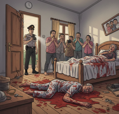 Seorang pria lanjut usia ditemukan tewas bersimbah darah di dalam kamar rumahnya, sementara sang istri ditemukan dalam kondisi kritis.