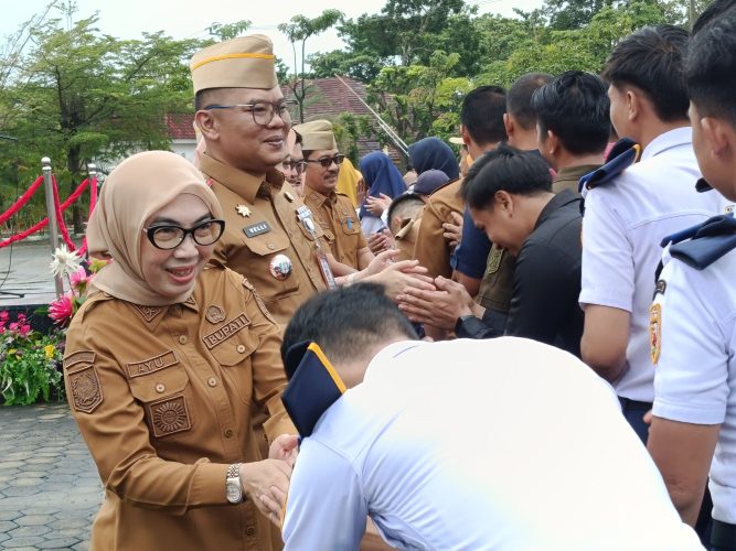 Bupati Way Kanan, Ayu Asalasiyah, S.Ked, hadir langsung dalam kegiatan tersebut didampingi Sekretaris Daerah Way Kanan, Machiavelli Herman Tarmizi, S.STP., M.IP. Keduanya tampak tersenyum hangat saat menyalami satu per satu jajaran pegawai yang hadir.